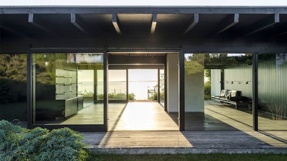 Huset er udtryk for en ny tids rumopfattelse med flydende rumforløb og udveksling mellem ude og inde gennem lange vinduesfacader til både haven og havet. Lette skydedøre sikrer åbne rumforløb, mens de sortmalede stolper giver mindelser om danske bindingsværkstraditioner. Silkeslebne bræddebeklædte gavle og et langstrakt marmorgulv skaber et roligt og indtagende indre, hvor naturens evigt skiftende farver sætter scenen.