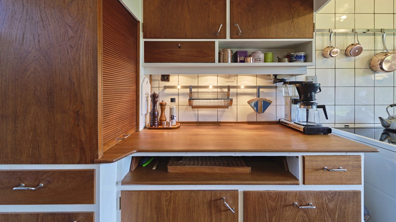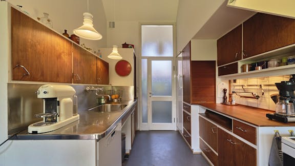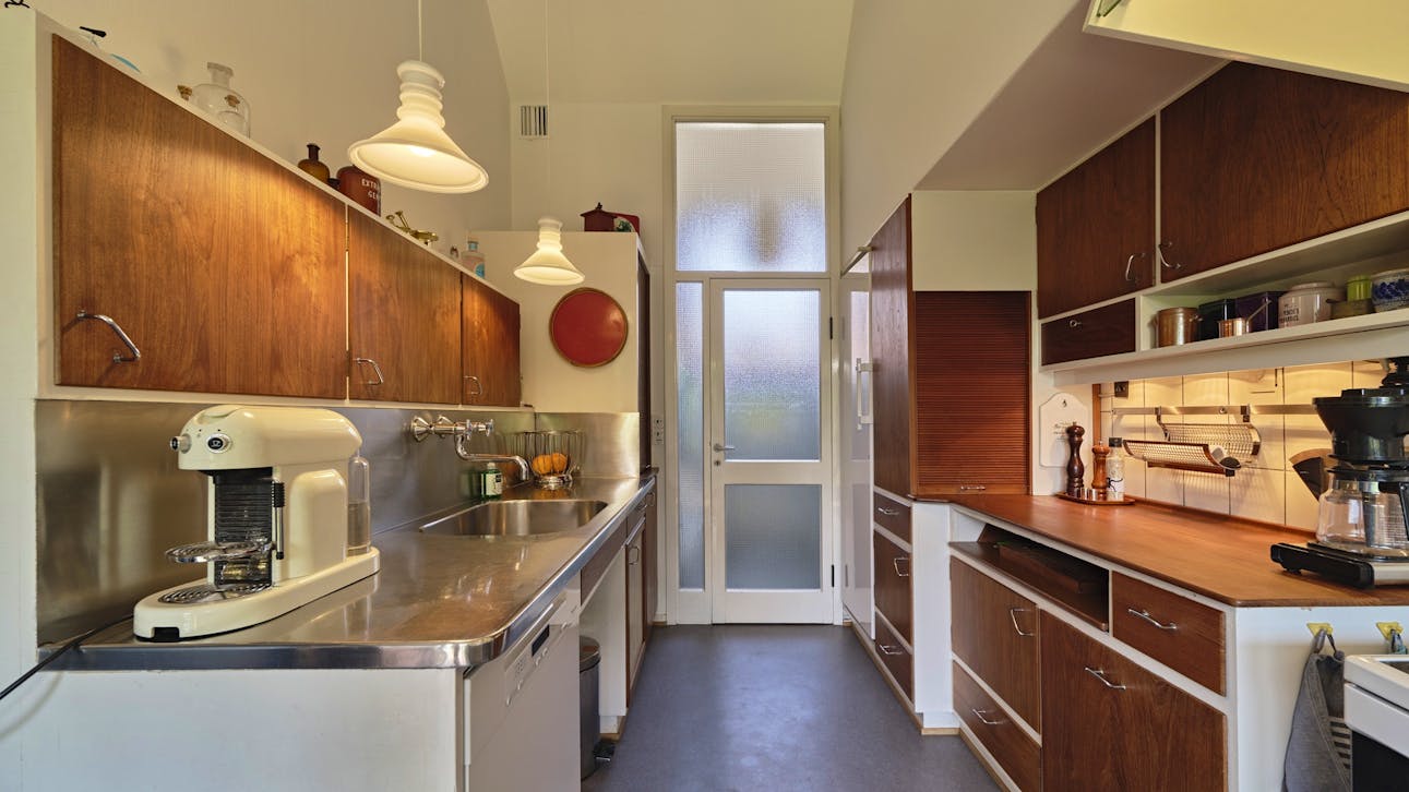 Huset fremstår yderst velbevaret. Det oprindelige forrammekøkken med original emhætte står intakt sammen med badeværelset med terrazzogulv og kehlet sokkel og originale klinker og Vola-armatur. Huset rummer desuden en lang række originale detaljer såsom indbyggede opbevaringsløsninger, integreret belysning, gennemgående køkkenskabe og en vareindleveringslem.
