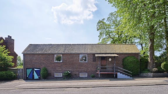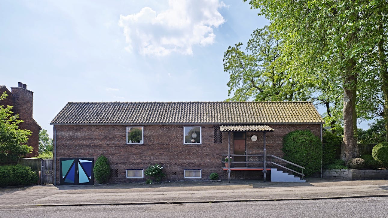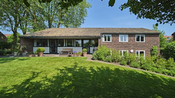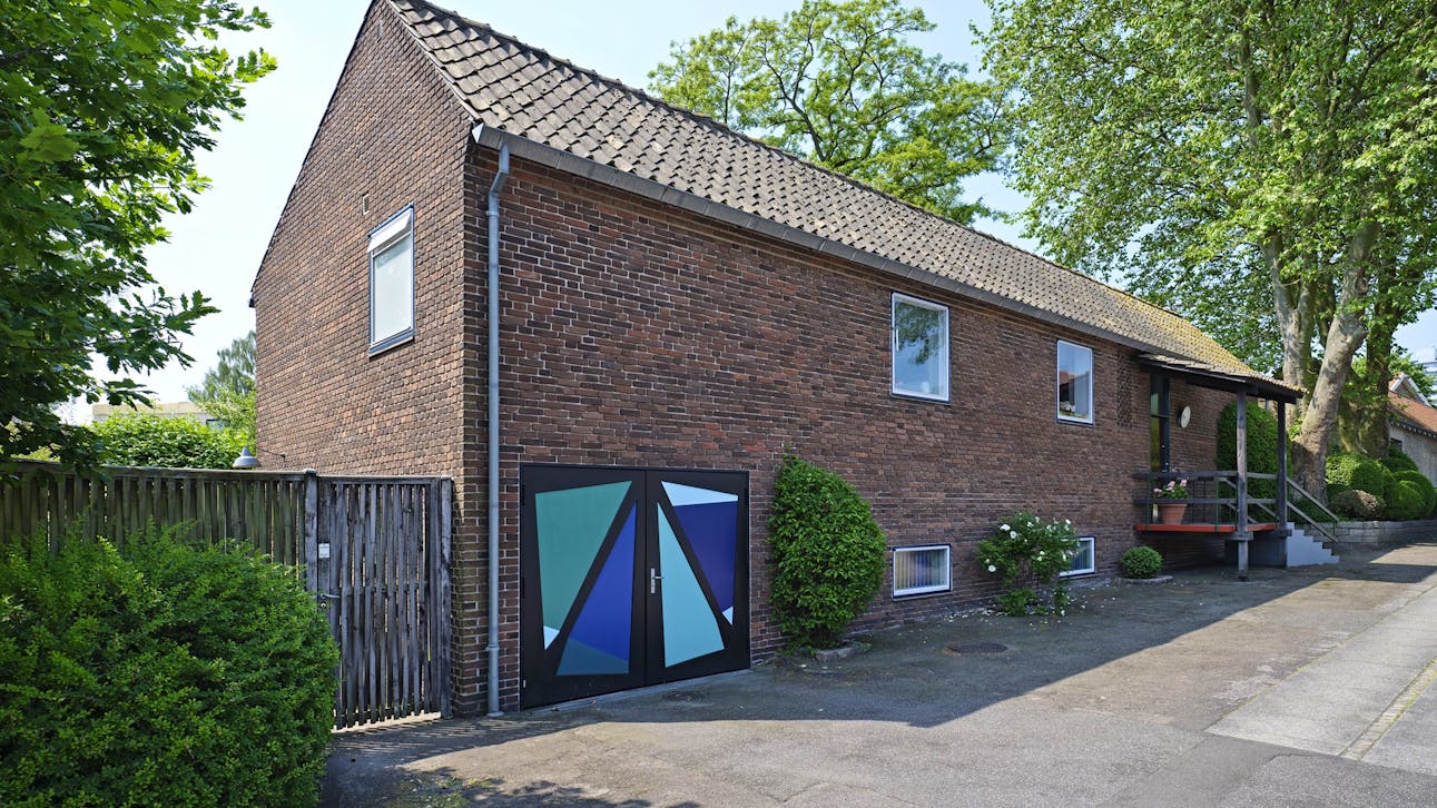 Den samme detaljering og omhu er lagt i facaden, hvor garageporten er udsmykket af kunstneren Richard Mortensen, kældervinduernes tremmer er malet i regnbuens farver, tagrenderne er trekantede, og der er felter med filigranmurværk, der trækker lys ind.
