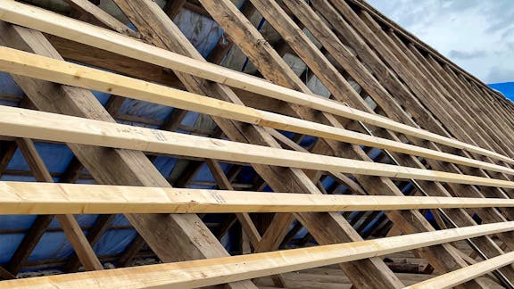 Her var tømrere, murere og malere i fuld gang med at reparere avlsbygningerne på tag og fag og udskifte nedslidte og tærede bygningsdele og materialer.